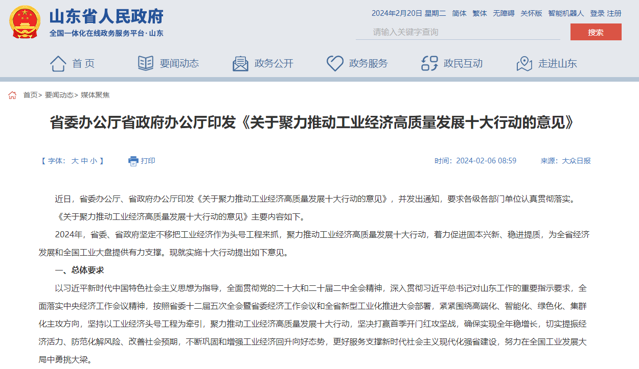 《意見》提出頭號工程引領、首季開門紅攻堅、規上工業擴量、工業技改提級、優質項目支撐、重點行業轉調、工業品需求提振、新質生產力培育、數實融合賦能、點線面載體培優等十大行動和38條舉措,為山東今年實施工業經濟頭號工程明確了重點發力部位。