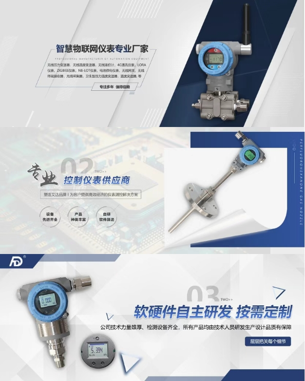 公司在多年的過程儀表的研發和實踐中,對相關技術掌握越發成熟和完善,同時結合市場的發展需要,公司于2016年研發出無線壓力、差壓、溫度,單法蘭,雙法蘭,投入式液位計系列物聯網傳感器,(4G\LORA\NBIOT\Zigbee多種通訊方式可選),同時艾達物聯網云平臺也成功上線,為客戶提供數據展示-信號傳遞-報警-數據分析-診斷-提供解決方案,為用戶提供完整的工業物聯網解決方案的相關服務。