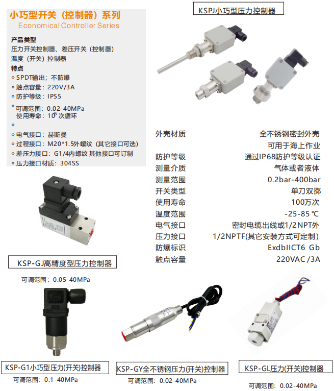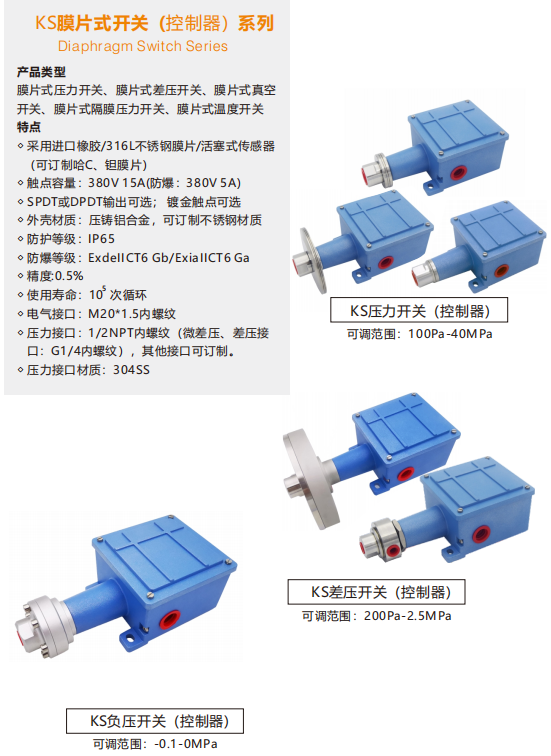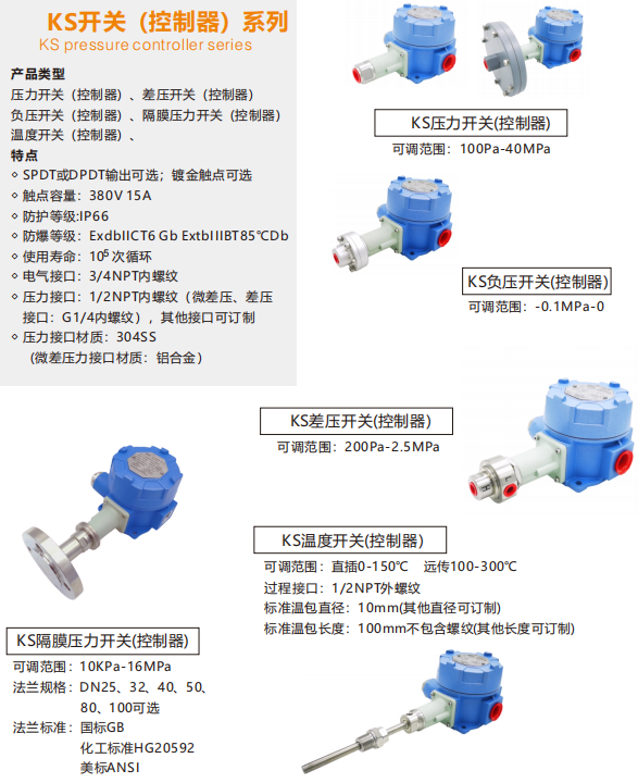 公司“KFT”品牌產(chǎn)品定位于過程控制儀表行業(yè)的中端及高端產(chǎn)品,以高性能、高標準、高服務(wù)及高競爭力的價格等特點,已被廣泛用于火電、核電、化工、冶金、液壓、航空、制藥、環(huán)保、造紙、鍋爐、水務(wù)等行業(yè);公司主營產(chǎn)品有:機械式壓力、差壓、負壓、溫度開關(guān)(控制器),智能壓力、差壓、溫度、液位變送器,智能壓力、溫度、流量、液位開關(guān)等。
